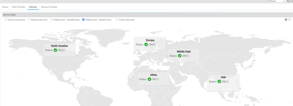 Select InsightsPrisma Access LocationsExplicit Proxy to see an overview of the health of all your Prisma Access locations for Explicit Proxy mobile users.