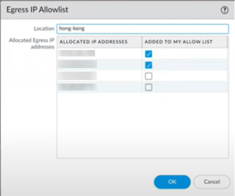 Prisma Access will allocate two addresses for each newly added location. If an existing location has previously had an autoscale event when a large number of mobile users logged in to a single location at the same time, Prisma Access allocates additional egress IP address in multiples of two, and an existing location could have four or more addresses.Find the new egress IP addresses that need to be added to your organization’s allow lists by selecting the Location name in the table.