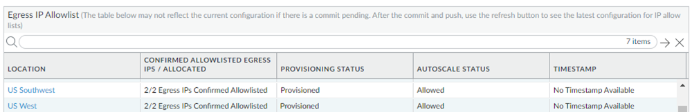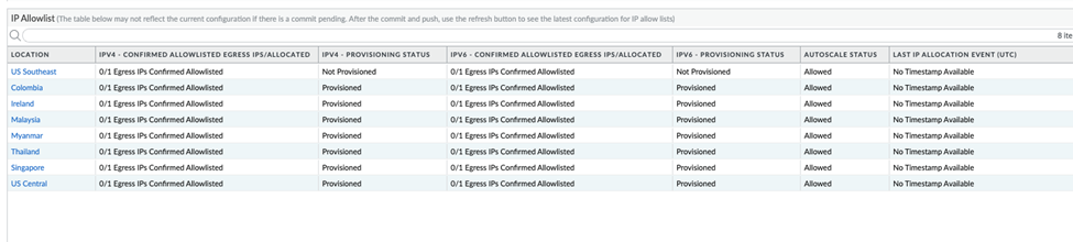 The Egress IP Allow List table contains the following additional fields:Field Description Location The onboarded mobile user location.Confirmed Allow Listed Egress IPs/Allocated The number of egress IP addresses that have been confirmed as being allow listed, and the number of egress IP addresses that have been allocated.Provisioning Status The allow listing status of the egress IP addresses.- Provisioned—You have added the egress IP addresses to your organization’s allow lists, have confirmed them as having been added in the Prisma Access UI by checking Added to My Allow List, and have committed and pushed your changes to fully provision the IP addresses.