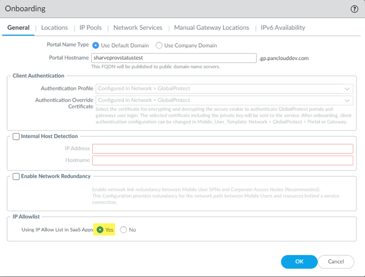 - Select PanoramaCloud ServicesConfigurationMobile Users—GlobalProtect.Select your Hostname and Configure it (for an existing deployment), or Configure your deployment for the first time (for a new deployment).Specify Using IP Allow List in SaaS Apps as Yes.