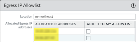 - When you onboard your locations during mobile user onboarding.Prisma Access allocates two gateway IP addresses for each location you onboard.If you onboard a location, and other locations in the same compute location are experiencing an autoscale event, Prisma Access might allocate more than two IP addresses for the new location. In this situation, be sure that you add all these IP addresses to your allow lists and confirm all addresses as being Added to My Allow List.