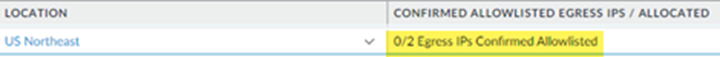 Continue your Prisma Access onboarding, including selecting the locations to use in your mobile users—GlobalProtect deployment, and Commit and Push your changes.It might take up to a minute for the changes to be reflected in the UI. If you view the Egress IP Allow List before committing and pushing your changes, it shows a status of 0/0 Egress IPs Confirmed Allow Listed, because Prisma Access has not assigned any egress IP addresses to your deployment.View the Egress IP Allow List table, and make a note of the egress IP addresses that need to be added to your allow lists.You can view the egress IP addresses in the Confirmed Allow Listed Egress IPs/Allocated field of the Egress IP Allow List table. The first number indicates whether or not the IP address has been confirmed as being added to your allow lists.The following example shows the IP addresses for the US Northeast location. The description of 0/2 Egress IPs Confirmed Allow Listed indicates that none of the two egress IP addresses have been marked as being added to your allow lists, and you need to add them.