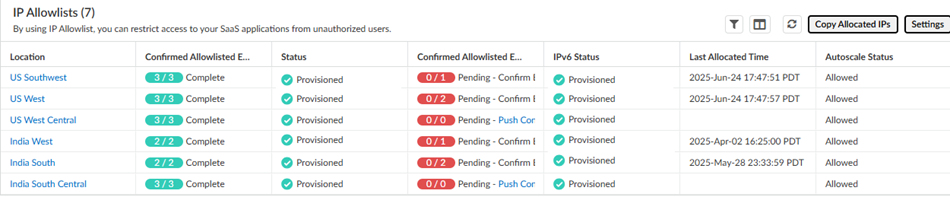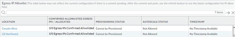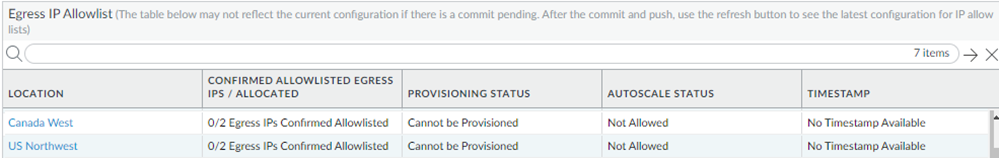 - Not Provisioned—Prisma Access has allocated IP addresses for the location, and you have added the egress IP addresses to your organization’s allow lists and confirmed them as having been added in the Prisma Access UI, but you have not yet onboarded this location.