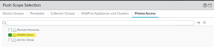Commit and push your changes to make them active in Prisma Access.- Select CommitCommit and Push and Edit Selections in the Push Scope.Select Prisma Access, then make sure that Mobile Users is selected.
