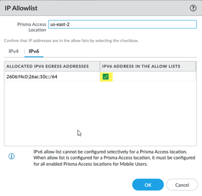 | You don’t need to enable all IPv4 addresses in each enabled location. | If you don’t select the IPv6 address in the Confirmed adding to my IPv6 Allowlist field (for Prisma Access (Managed by Strata Cloud Manager) deployments) or IPv6 Address in the Allow Lists ( (for Prisma Access (Managed by Panorama) deployments), the commit process fails until you select that check box. |