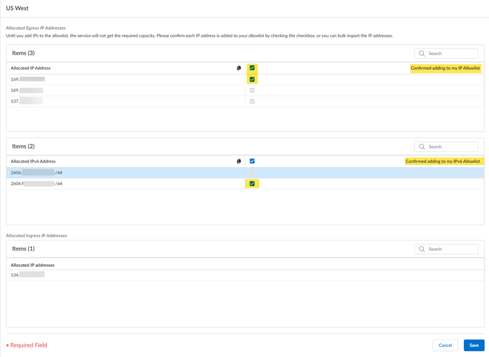 Retrieve the IP addresses for a newly-onboarded location or during an auto-scaling event.You can also retrieve the public IP addresses using the Prisma Access UI instead of using the API.- Select the Location name to find the new egress IP addresses allocated to the location.Select Confirmed adding to my IP Allowlist to add these IP addresses to the allow lists for your SaaS applications before you confirm them in Prisma Access.If you have IPv6 addresses, select Confirmed adding to my IPv6 Allowlist. Prisma Access provides you with an IPv6 subnet instead of specific IPv6 addresses.Any check boxes that are grayed out indicate IP addresses that are already being used and you cannot add or remove them. The Allocated ingress IP addresses are the ingress IP addresses you should add to your NGFW allow list or client endpoint policies.