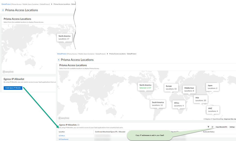 - Enable egress IP allow listing to display the IP addresses for onboarded Prisma Access locations.Copy and add the allocated IP addresses to the allow lists of your SaaS applications.Migrate to confirm the IP addresses allocated for the onboarded locations in Prisma Access.
