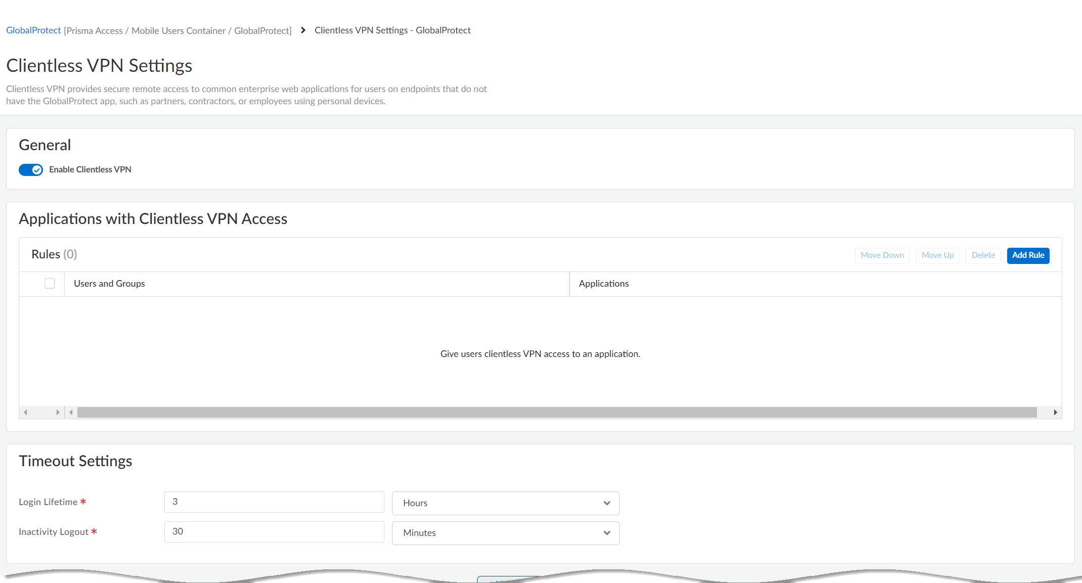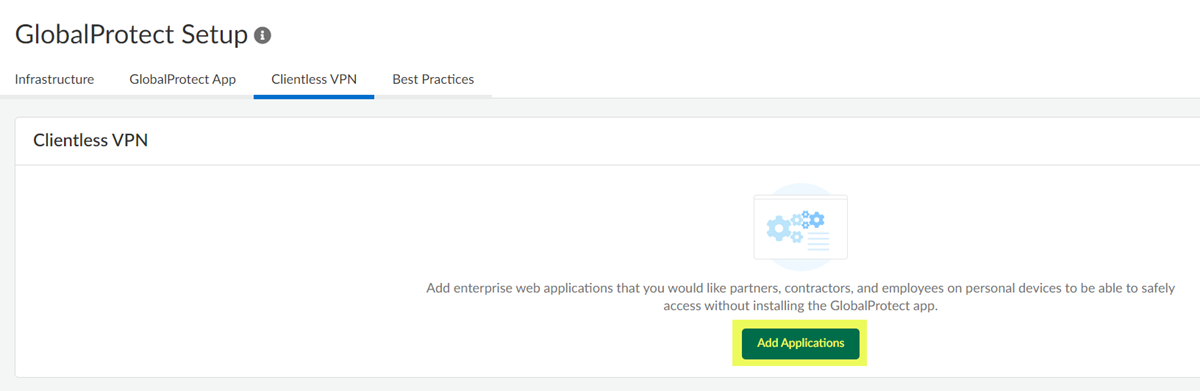 - Go to SettingsPrisma Access SetupGlobalProtectGlobalProtect SetupClientless VPN and Add Applications.