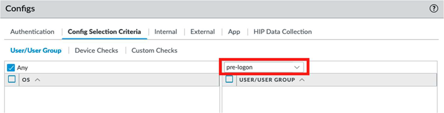 In the Agent area, Clone the default configuration. Change the configuration name to Pre-logon to match the connect method for machine certificate authentication.Select the newly cloned agent configuration.Select Config Selection Criteria. Under the User/User Group configuration, select pre-logon from the drop-down above the USER/USER Group configuration box, and ensure that the configuration is set to Any.