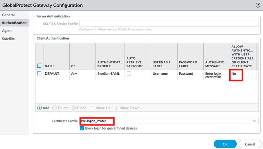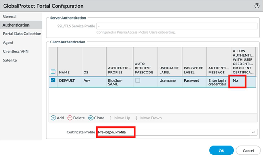 Configure the GlobalProtect portal to authenticate connections with a machine certificate.- Go to NetworkGlobalProtectPortalsGlobalProtect_PortalAuthentication.Under Allow Authentication with User Credentials OR Client Certificate, select No to enforce certificate-based authentication only.For Certificate Profile, select the Pre-logon_Profile you created, and click OK.