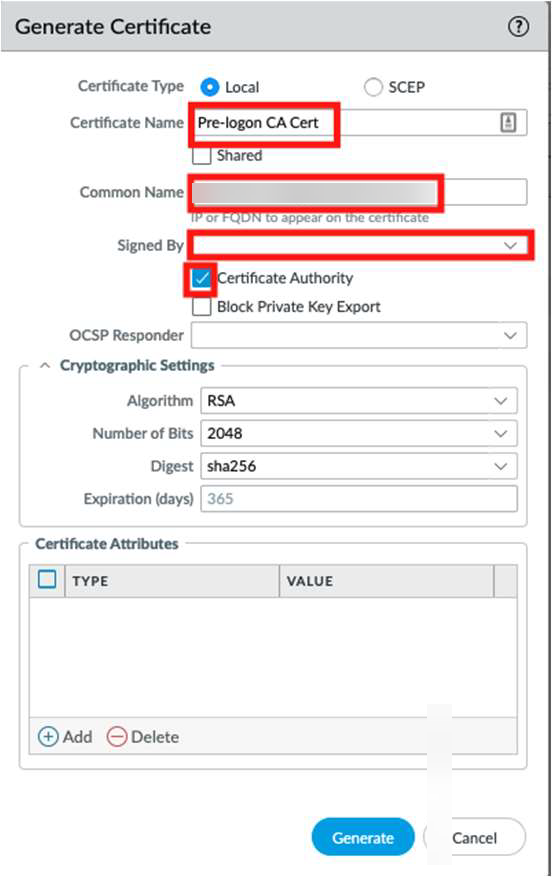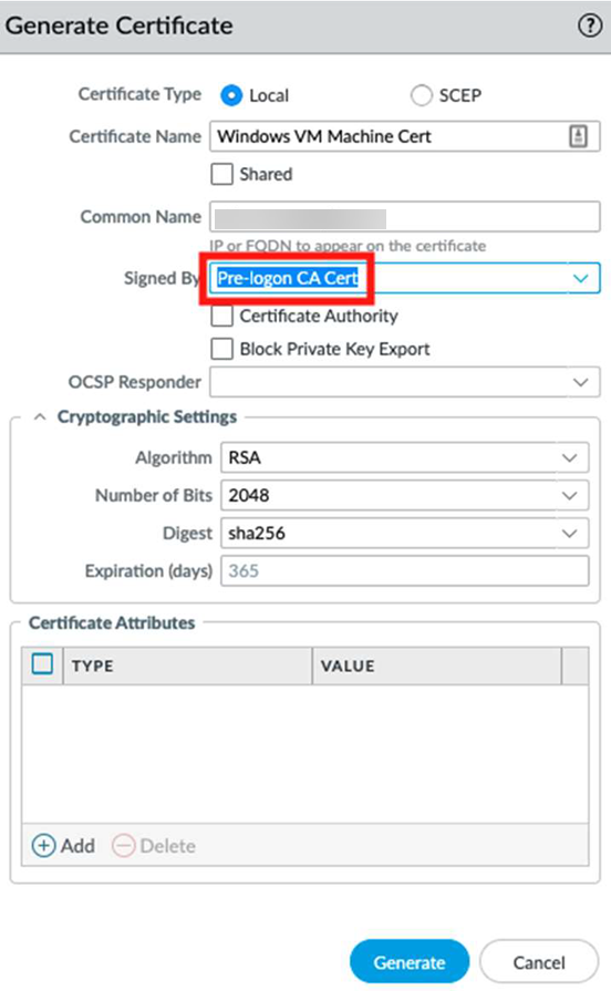 After you configure the self-signed CA, generate the machine certificate.- Enter a Certificate Name and a Common Name.In the Signed By drop-down, select the Pre-logon CA Cert that you created in step 1.Generate the Windows VM Machine Certificate that you later install on a Windows machine.This certificate is a child of the Pre-logon CA.