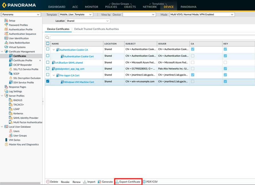 Install the machine certificate at the mobile users' endpoints, which are used for authentication.- Go to DeviceCertificate ManagementCertificates.Be sure that you're still in the Mobile_User_Template. Select the Windows VM Machine Cert that you created previously, and select Export Certificate to download it as a PKCS12 file with a passphrase.
