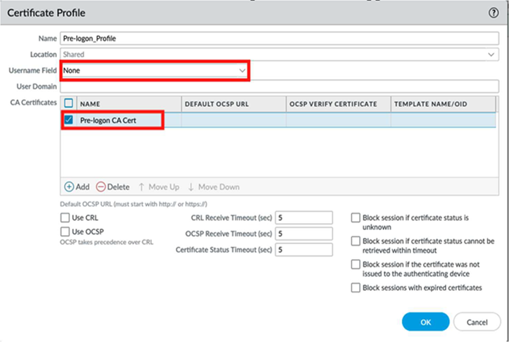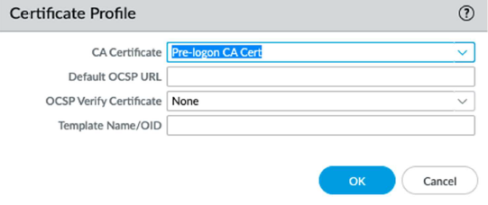 To create a certificate profile that includes the pre-logon CA certificate, go to DeviceCertificate ManagementCertificate Profile.Use this CA to validate the machine certificate presented by the GlobalProtect client during the pre-logon tunnel initialization.Create and name the profile. Ensure that the Username Field is None to prevent the certificate mapping to a user.