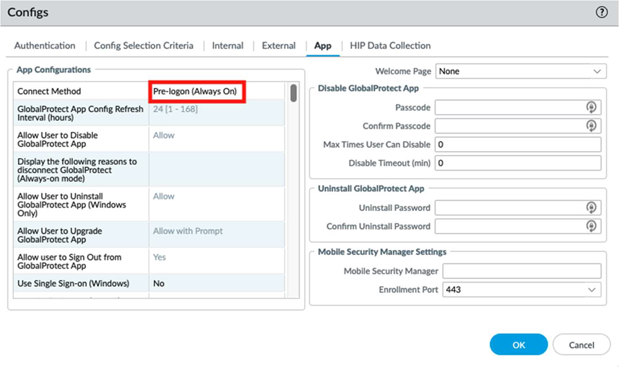 Select the App tab.Select Pre-logon (Always On), and select OK to return to the Agent area.