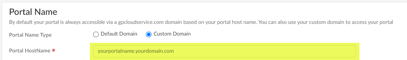 - Default Domain—If you select this option, your portal hostname uses the default domain name: .gpcloudservice.com. In this case, simply enter a Portal Hostname to append to the default domain name. Prisma Access for Users will automatically create the necessary certificates and publish the hostname to public DNS servers.