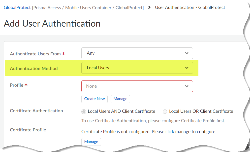 Set up User Authentication so that only legitimate users have access to your services and applications. Go to Configuration NGFW and Prisma AccessConfiguration ScopePrisma AccessGlobalProtectInfrastructureUser Authentication.To test your setup, you can add users who Prisma Access authenticates locally, or you can go straight to setting up enterprise-level authentication. Learn more on how to Enable Mobile Users to Authenticate to Prisma Access.