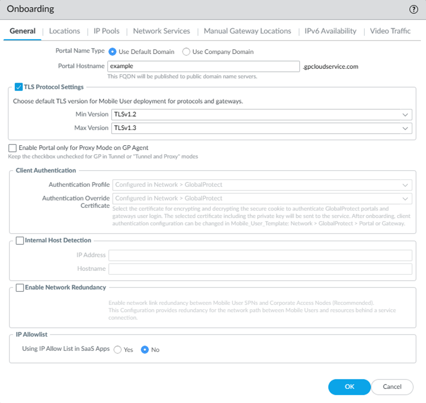 If you need to upload a new certificate, import the certificate and private key; then, view the SSL/TLS service being used by Prisma Access under NetworkGlobalProtectPortalsGlobalProtect_PortalAuthentication and check the SSL/TLS Service Profile name. This field only displays if you're using a company domain instead of the default domain. You can then select DeviceCertificate ManagementSSL/TLS Certificate Profile and replace the certificate in the SSL/TLS profile used by the portal with the certificate you imported.(Optional) Configure TLS Protocol Settings.Select a Min Version and a Max Version. Do not select a Max Version of Max.Select an Authentication Profile that specifies how Prisma Access should authenticate mobile users or create a new one.If you added a parent device group that contains an authentication profile configuration, you should see it on the list of available profiles. If you did not push the profile in the device group, you can create an authentication profile now.After you commit and push your changes, you can't make any changes to the authentication profile and authentication override certificate in this area and the choices become read-only. To make changes after initial onboarding, modify or add one or more GlobalProtect client authentication configurations under the Mobile_User_Template.Select an Authentication Override Certificate to encrypt the secure cookies that mobile users authenticate to the portal and gateway.If you added a parent device group that contains the certificate you want to use to encrypt authentication cookies, you should see it on the list of available certificates. If you did not push a certificate in the device group, you can import or generate one now.(Optional) To ensure that your mobile users always have access to the services and applications that are accessible from service connections, Enable Network Redundancy between the portals or gateways and service connections.This functionality provides redundant network paths between the mobile user dataplane and service connections in different compute locations. Enabling redundancy provides users with more resilient access to resources behind service connections in a data center or headquarters locations. Because a service connection is required for mobile users to access resources from remote networks, users also have more resiliency in accessing resources in remote network locations.(Optional) If you do not require GlobalProtect endpoints to have tunnel connections when on the internal network, enable Internal Host Detection.- Select the Internal Host Detection check box.