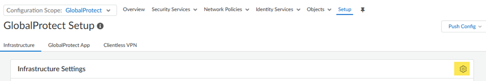 Go to Configuration NGFW and Prisma AccessConfiguration ScopePrisma AccessGlobalProtectInfrastructure and click the gear to open the Infrastructure Settings.