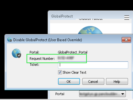 Generate a ticketAfter setting the Agent Override Key and the option to Allow with Ticket, you’ll be able to Generate Ticket.When a user attempts to disable GlobalProtect in the app, GlobalProtect will display a request number to them. Submit that request number here to generate a ticket for GlobalProtect to be disabled for that user.