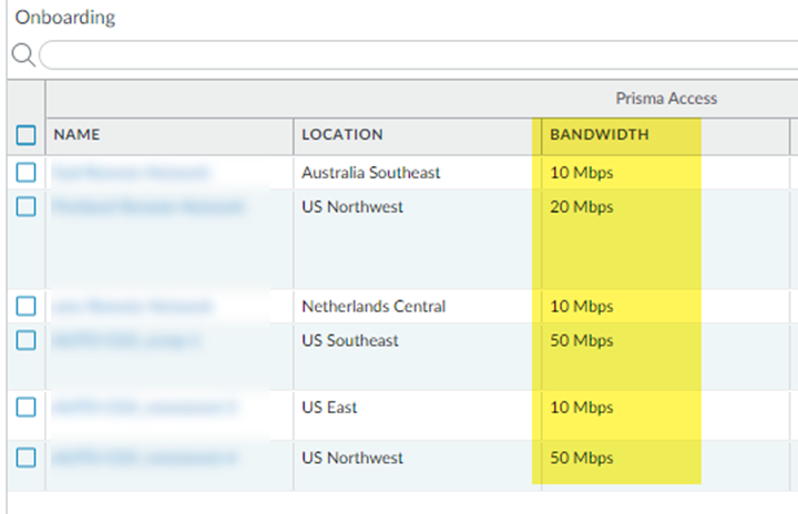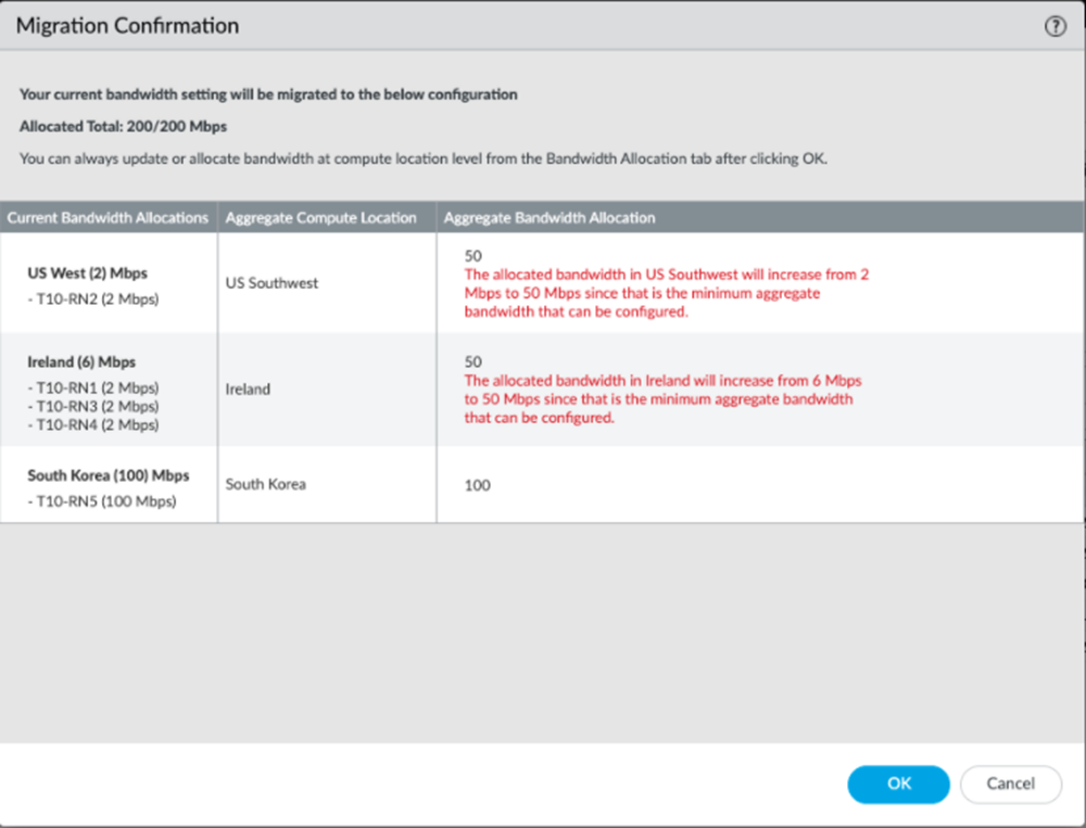 - If all the location or locations in a compute location have a total bandwidth of less than 50 Mbps, Prisma Access will increase the bandwidth to 50 Mbps for that compute location. Prisma Access provides you with the locations that require the bandwidth increase during the migration process.