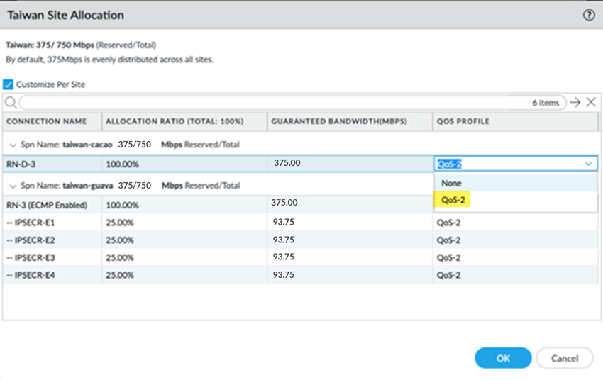 - Understand how to specify a guaranteed bandwidth ratio and how to customize bandwidth per site.Using a guaranteed bandwidth ratio, you can allocate a percentage of the total allocated bandwidth in the compute location. Prisma Access divides the guaranteed bandwidth equally by the number of IPSec termination nodes in the compute location.By customizing the bandwidth per site, you can apply an allocation ratio for the sites an a single IPSec termination node and specify QoS profiles per site in the remote network Settings. Alternatively, you can specify a QoS profile during remote network configuration by selecting the remote network and specifying a QoS profile in the QoS tab.