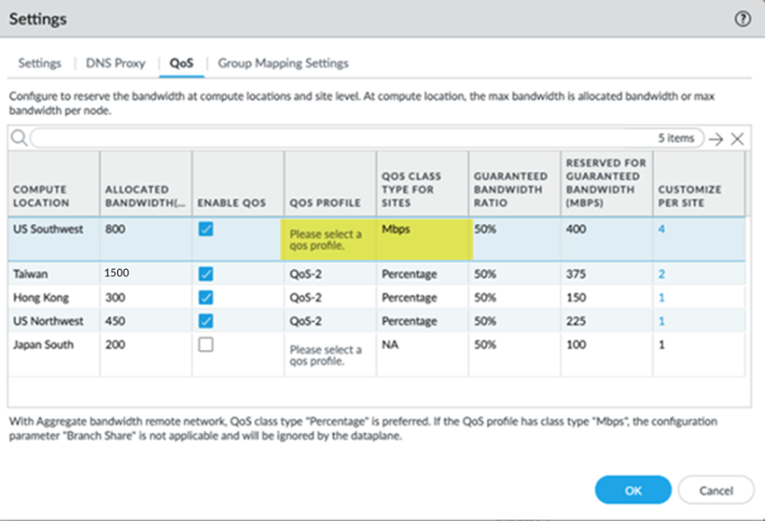- After migration, any locations who use QoS profiles with a Class Bandwidth Type of Mbps show a QoS Class Type For Sites of Mbps for their corresponding compute location in the QoS tab. QoS Profiles with a Class Bandwidth Type of Percentage show a QoS Class Type For Sites of Percentage.In addition, you cannot select any QoS profiles that have a Class Bandwidth Type of Mbps. The following screenshot shows the US Southwest compute location using a QoS profile with a Class Bandwidth Type of Mbps. That choice is not selectable in the drop-down in the QoS Profile area.