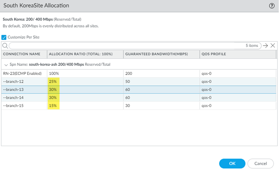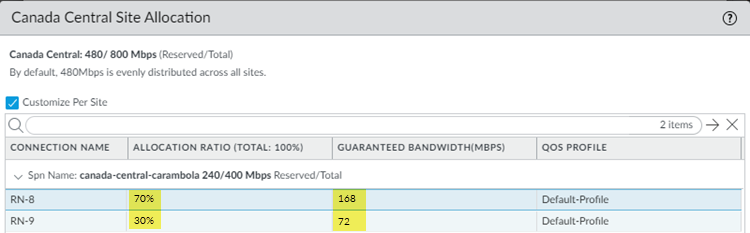 - Select PanoramaCloud ServicesConfigurationRemote NetworksSettings.Click the gear to edit the settings and select QoS.Enable QoS, assign a QoS Profile (Default-Profile in this example) and a Guaranteed Bandwidth Ratio to the Canada Central compute location.Select Customize Per Site, enable Customize Per Site, then apply a higher bandwidth Allocation Ratio for the RN-8 remote network (for the Canada East location) than the RN-9 remote network (for the Canada Central location).The following example shows an Allocation Ratio of 70% for RN-8 and 30% for RN-9. The Guaranteed Bandwidth (Mbps) changes accordingly, showing the new guaranteed bandwidth amounts.