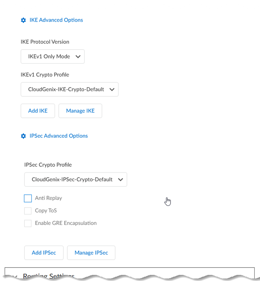 Profile.To add a crypto profile, Add IPSec. To manage an existing IPSec profile, Manage IPSec and select the profile to edit.