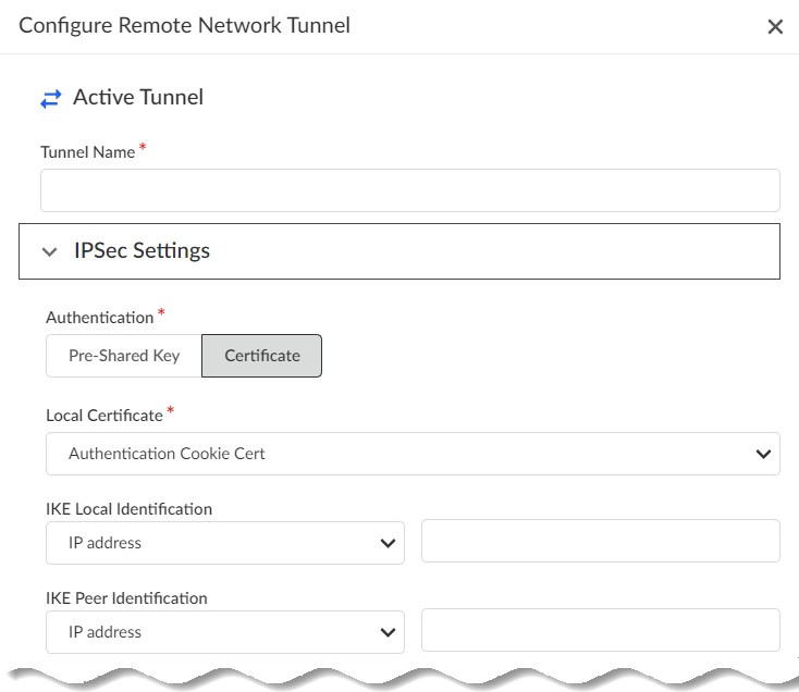 Certificate).If you specify Pre-Shared Key, enter and confirm the Pre-Shared Key.If you specify a Certificate, enter the Local Certificate to use. This certificate must already exist in Strata Cloud Manager.
