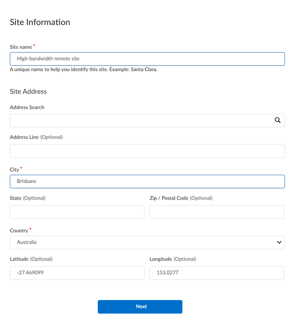 To onboard a Remote Network—High Performance, you specify the branch site's location, and