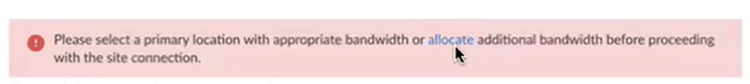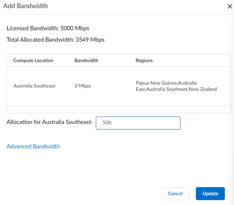 If you have not yet allocated bandwidth, Prisma Access prompts you to allocate bandwidth for the compute location that's associated with the location you selected. Specify a minimum bandwidth of 50 Mbps per compute location.
