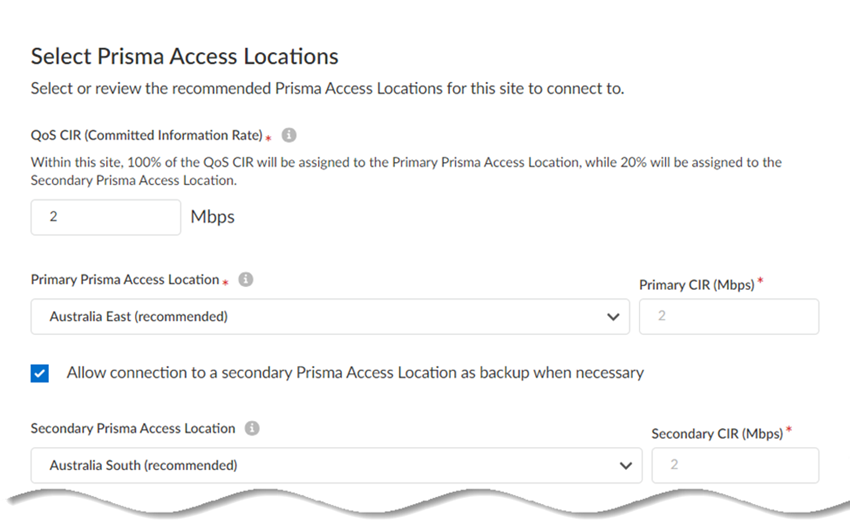 Click Next.Enter the QoS CIR (Committed Information Rate) in Mbps.If you have multiple remote networks that share bandwidth in a compute location, and if there is bandwidth contention with other sites in that compute location, the Remote Network—High Performance receives at least the bandwidth specified in the CIR.If you configure primary and secondary sites, you specify different compute regions and the secondary region gets 20% of the CIR. For example, if you configure a CIR of 100 Mbps to a site, Prisma Access provides the primary site with 100 Mbps CIR and the secondary site with 20 Mbps CIR.If the CIR is 500 Mbps and if all remaining bandwidth in the compute location is used by other sites, Prisma Access drops any bandwidth in excess of 500 Mbps. However, if other sites are not using bandwidth, the bandwidth for the high-performance remote network can go above 500 Mbps up to the allocated bandwidth in the compute location.Enter a minimum CIR of 1 Mbps and a maximum of 2000 Mbps. Don't exceed the bandwidth you specify for the compute region.Select a Primary Prisma Access Location.If multiple locations are Recommended in the list; select the location that works best for your deployment.(Optional) To create a secondary (backup) site, select Allow connection to a secondary Prisma Access Location as backup when necessary and then select a Secondary Prisma Access Location.If you select this choice, Prisma Access prepopulates the best secondary location or locations that are in a different compute location than the primary location. If multiple locations are Recommended; select the location that works best for your deployment.