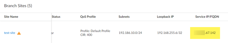 Find the Service IP address that you specify on your CPE.When you set up the remote network, use the service IP address as the peer IP address on your CPE to terminate the IPSec tunnel.- Go to InsightsBranch Sites.Find the Service IP/FQDN address.