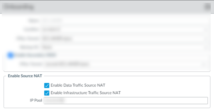 - Source NAT Pool—Specify the IP address pool used to perform NAT on the mobile user IP address pool, Infrastructure subnet, or both.- Use a private IP (RFC 1918) subnet or a suitable subnet that is routable in your routing domain.