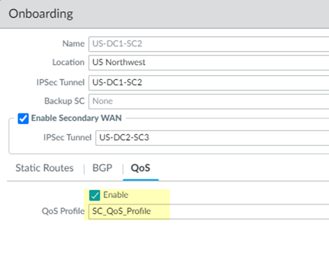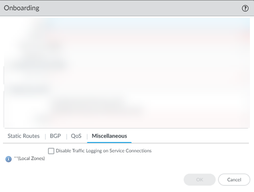 (Optional) If you configured a Secondary WAN and you need to change the Peer Address or Local Address for the secondary (backup) BGP peer, deselect Same as Primary WAN and enter a unique Peer and, optionally, Local IP address for the secondary WAN.In some deployments (for example, when using BGP to peer with an AWS VPN gateway), the BGP peer for the primary and secondary WAN might be different. In those scenarios, you can choose to set a different BGP peer for the secondary WAN.For BGP deployments with secondary WANs, Prisma Access sets both the primary and secondary tunnels in an UP state, but follows normal BGP active-backup behavior for network traffic. Prisma Access sets the primary tunnel as active and sends and receives traffic through that tunnel only; if the primary tunnel fails, Prisma Access detects the failure using BGP rules, sets the secondary tunnel as active, and uses only the secondary tunnel to send and receive traffic.(Optional) Enable Quality of Service for the service connection and specify a QoS profile or add a New QoS Profile.You can create QoS Profiles to shape QoS traffic for remote network and service connections and apply those profiles to traffic that you marked with PAN-OS security policies, traffic that you marked with an on-premises device, or both PAN-OS-marked and on-premises-marked traffic. See QoS for Remote Networks for details.![]() (Optional) Configure Miscellaneous settings. (Optional) Configure Miscellaneous settings.- (Optional) Disable Traffic Logging on Service Connections to disable logging on the service connections for your Prisma Access deployment.If the majority of the traffic flows logged by the service connections are asymmetric, disabling service connection logging might be required to reduce the consumption of Strata Logging Service logging storage. If your deployment does not have asymmetric flows via the service connections, you don't need to disable logging.![]() Commit your changes to Panorama and push the configuration changes to Prisma Access. Commit your changes to Panorama and push the configuration changes to Prisma Access.- Click CommitCommit and Push.Edit Selections and, in the Prisma Access tab, make sure that Service Setup is selected in the Push Scope, then click OK.![]() Commit and Push.Do not Commit to Panorama, as that only commits the changes locally to Panorama and does not push the changes to the Prisma Access infrastructure.Add more service connections by repeating Step 2 through Step 11.Configure the IPSec tunnel or tunnels from your IPSec-capable device on your corporate network back to Prisma Access. Commit and Push.Do not Commit to Panorama, as that only commits the changes locally to Panorama and does not push the changes to the Prisma Access infrastructure.Add more service connections by repeating Step 2 through Step 11.Configure the IPSec tunnel or tunnels from your IPSec-capable device on your corporate network back to Prisma Access.- To determine the IP address of the tunnel within Prisma Access, select PanoramaCloud ServicesStatusNetwork Details, click the Service Connection radio button, and note the Service Endpoint Address for the site.The Service Endpoint Address (either an FQDN or an IP address) is the public-facing address that you will need to connect to when you create the tunnel from your IPSec-capable device back to the service connection.![]() On your IPSec-capable device at the corporate location, configure an IPSec tunnel that connects to the Service Endpoint Address within Prisma Access and commit the change on that device so that the tunnel can be established. On your IPSec-capable device at the corporate location, configure an IPSec tunnel that connects to the Service Endpoint Address within Prisma Access and commit the change on that device so that the tunnel can be established.Verify Service Connection StatusTo verify that the service connection has been successfully set up, select Panorama > Cloud Services > Status > Status and check that the Status is OK.If you created a service connection with placeholder values to enable communication between mobile users and users at remote networks, you do not need to verify the service connection status.The Deployment Status area allows you to view the progress of onboarding and deployment jobs before they complete, as well as see more information about the status of completed jobs.![]() If the status is not OK, hover over the Status icon to view any errors.To see a graphical representation of the service connection along with status details, select Service Connection on the Monitor tab. If the status is not OK, hover over the Status icon to view any errors.To see a graphical representation of the service connection along with status details, select Service Connection on the Monitor tab.![]() Select a region to get more detail about that region. Select a region to get more detail about that region.![]() Click the tabs below the map to see additional information about the service connections.Status tab: Click the tabs below the map to see additional information about the service connections.Status tab:- Location—The location where your service connection is deployed.