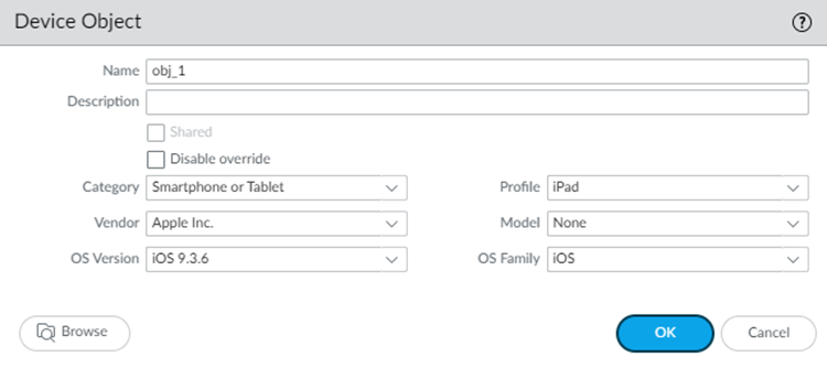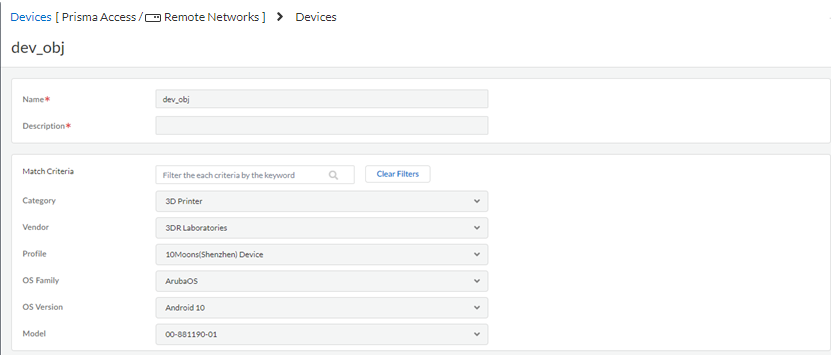 Configure a device object and enter device attributes.- Go to ObjectsDevices and Add a device object that matches all the Device-ID attributes.Be sure that you're in the Mobile_User_Device_Group, Remote_Network_Device_Group, or the Shared device group.Add a device object that matches attributes for the third-party objects.The Cloud Identity Engine Mappings area displays the attributes of the third-party devices; you can use any attributes retrieved from there.