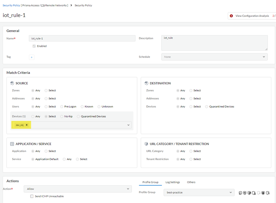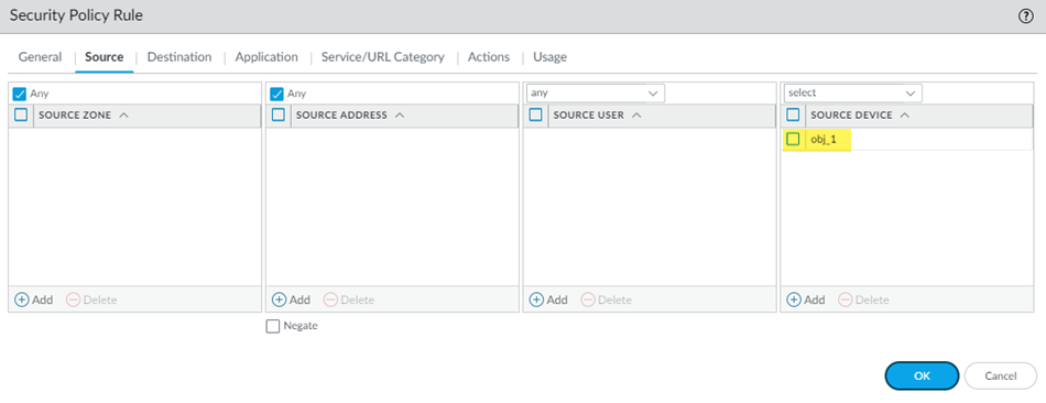 Go to PoliciesSecurityPre Rules and Add a Security policy rule.Be sure that you're in the Mobile_User_Device_Group, Remote_Network_Device_Group, or the Shared device group.If you're configuring a Security policy rule for a remote network or shared device group, you can add the device objects you created to SourceSource Device or to DestinationDestination Device.If you're configuring a Security policy rule for mobile users, you can only use device objects for destination devices. Add the device objects you created to DestinationDestination Device.