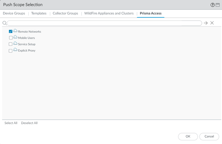 Commit and push your changes, making sure that you select Mobile Users or Remote Networks in the Push Scope.- Click CommitCommit and Push.Edit Selections and, in the Prisma Access tab, make sure that you select Mobile Users or Remote Networks in the Push Scope, then click OK.
