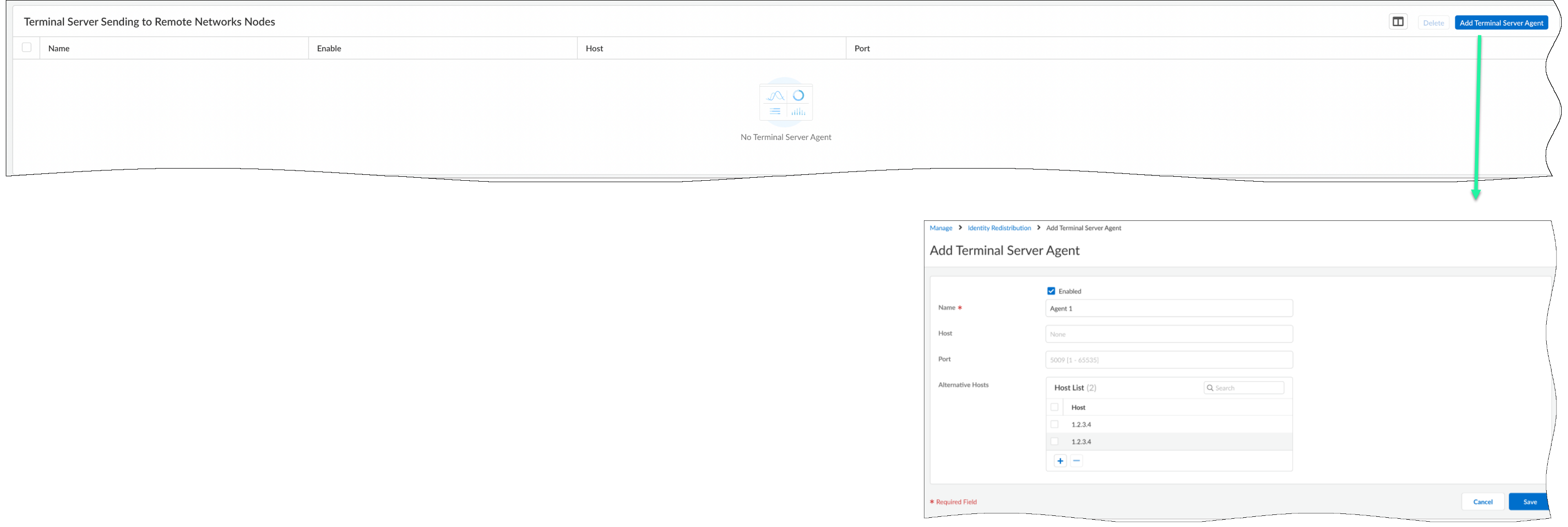 Configure the Terminal Server agent for User Mapping.The Terminal Server (TS) agent allocates a port range to each user to identify specific users on Windows-based terminal servers. The TS agent notifies Prisma Access of the allocated port ranges, so that Prisma Access can enforce policy based on users and user groups.On the Identity Redistribution dashboard, set the configuration scope to Remote Networks, and Add Terminal Server Agent under Terminal Server Sending to Remote Networks Nodes.- By default, the configuration is Enabled.
