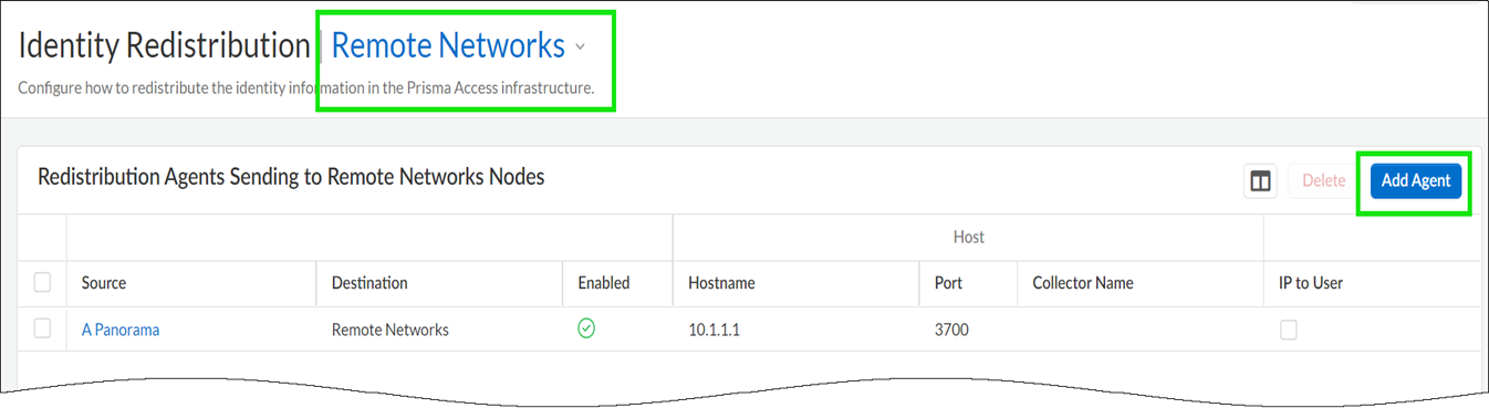 Send Identity Data from on-premises Devices to Prisma Access.Add on-premises devices to Prisma Access as redistribution agents; the devices you add will be able to distribute identity data to Prisma Access.-
