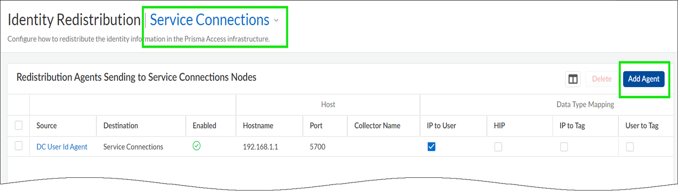 From devices at service connection sites:Go to the Identity Redistribution dashboard, set the configuration scope to Service Connections, and Add Agent. In addition to specifying the host details, select the type of data the device shares with Prisma Access. Optional settings include the name and a pre-shared key for the device.