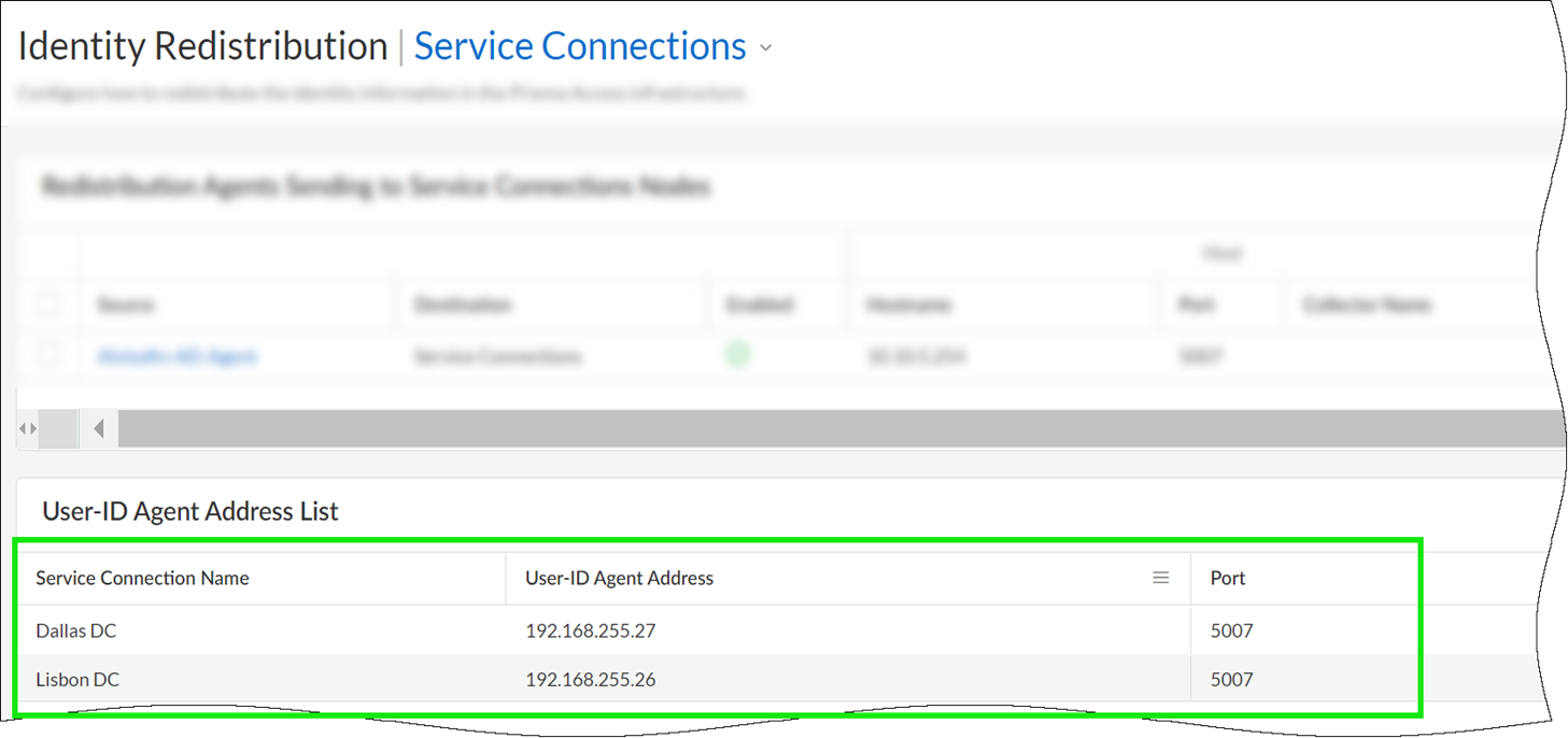 - Confirm Your Service Connection Setup.If you haven’t yet set up a service connection for your HQ or data centers, begin by configuring a service connection. A service connection is required for Prisma Access to share identity data across your environment; Prisma Access automatically enables service connections to work as redistribution agents. A newly created service connection site will be ready to be used as a redistribution agent when you see that it's been assigned a User-ID agent Address (Prisma Access does this automatically, and it'll just take a few minutes).User-ID Redistribution Management—Sometimes, granular controls are needed for user-ID redistribution in particularly large scale Prisma Access deployments. User-ID Redistribution Management lets you manually disable the default identity redistribution behavior for certain service connections by removing the check mark in the User ID column, and then select specific service connections to be used for identity redistribution. It's not necessary to do this for most configurations. Contact Palo Alto Networks support to activate this functionality.Go to ConfigurationNGFW and Prisma AccessIdentity ServicesIdentity Redistribution and set the configuration scope to Service Connections to verify the service connection User-ID agent details.Send Identity Data from Prisma Access to on-premises Devices.The service connection’s User-ID agent information is all you need to configure Prisma Access to distribute identity data to on-premises devices.Go to ConfigurationNGFW and Prisma AccessIdentity ServicesIdentity Redistribution and set the configuration scope to Service Connections to get the service connection User-ID agent details.Use these details to configure Prisma Access as a data redistribution agent on Panorama or a Palo Alto Networks NGFW.