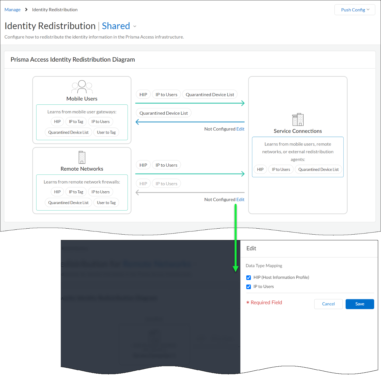 To activate your changes, push the configuration to Prisma Access.Identity Redistribution (Panorama)