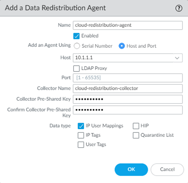 Configure the on-premises firewall to collect the User-ID mapping from Prisma Access.- From the on-premises firewall, select DeviceData RedistributionAgents.Add a User-ID agent and give it a Name.Select Host and Port.Enter the User-ID Agent Address (for a service connection) or EBGP Router Address (for a remote network connection) from Prisma Access in the Host field.Enter the Collector Name and Collector Pre-Shared Key for the Prisma Access collector you created earlier in the procedure.Select IP User Mappings.Click OK.Repeat these steps for each service connection or remote network connection for which you want to redistribute mappings.