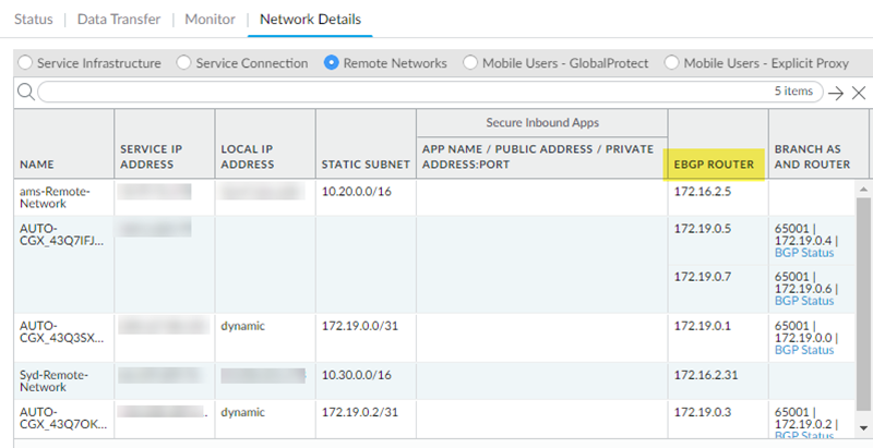 - For remote network connections, find the EBGP Router address (PanoramaCloud ServicesStatusNetwork DetailsRemote NetworksEBGP Router).