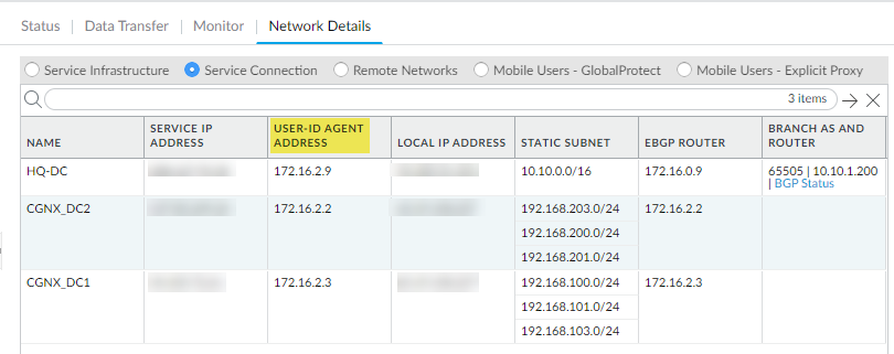 - For service connections, find the User-ID Agent Address (PanoramaCloud ServicesStatusNetwork DetailsService ConnectionUser-ID Agent Address).If you haven’t yet set up a service connection for your HQ or data centers, begin by configuring a service connection. Prisma Access uses service connections to share identity data across your environment; Prisma Access automatically enables service connections to work as redistribution agents. A newly created service connection site will be ready to be used as a redistribution agent when you see that it's been assigned a User-ID agent Address (Prisma Access does this automatically, and it'll just take a few minutes).User-ID Redistribution Management—Sometimes, granular controls are needed for user-ID redistribution in particularly large scale Prisma Access deployments. User-ID Redistribution Management lets you manually disable the default identity redistribution behavior for certain service connections by removing the check mark in the User ID column, and then select specific service connections to be used for identity redistribution. It's not necessary to do this for most configurations. Contact Palo Alto Networks support to activate this functionality.
