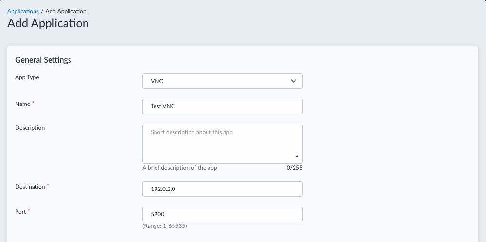 Configure general settings for the app.- Select App TypeVNC.Enter a Name for the app.(Optional) Enter a description for the app.Enter the Destination FQDN or IP address of the app. The FQDN or IP address must be reachable using a Service Connection in your Prisma Access tenant.Enter the Port for the destination, if different from the default port.You can enter only one port between 1-65535. (Default: 5900)