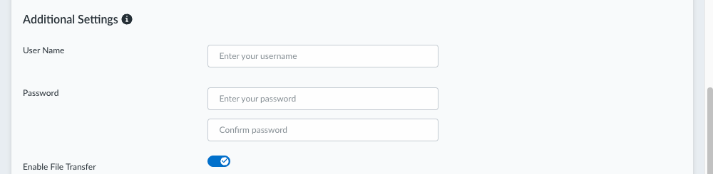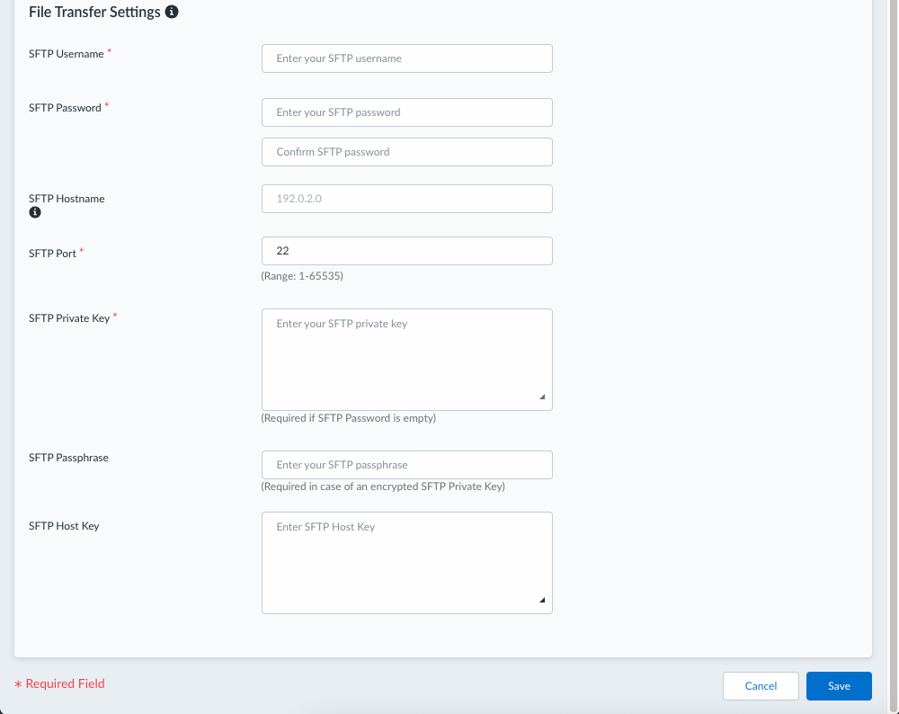 If you enabled file transfer in the previous step, configure the file transfer settings.- Enter your SFTP Username and SFTP Password. If you don't provide a password, you must provide the SFTP private key.The SFTP Hostname is automatically populated with the Destination FQDN or IP address. No entry is required.Enter the SFTP Port to use for file transfers. You can enter only one port between 1-65535. (Default: 22)Enter the SFTP Private Key. This is required if you don't enter an SFTP password.(Optional) Enter the SFTP Passphrase. This is required if the SFTP private key is encrypted.(Optional) Enter the SFTP Host Key.