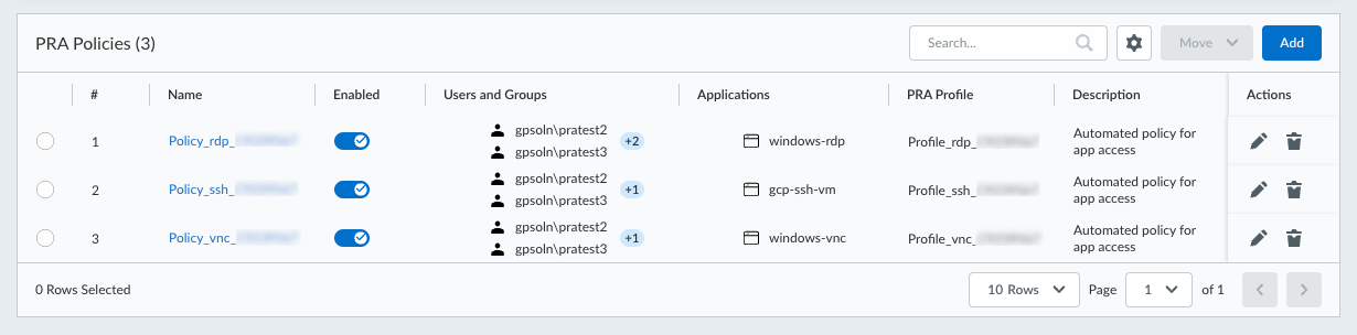 - Go to ConfigurationPrivileged Remote AccessPortal.The PRA Policies table shows the policies that have been set up.