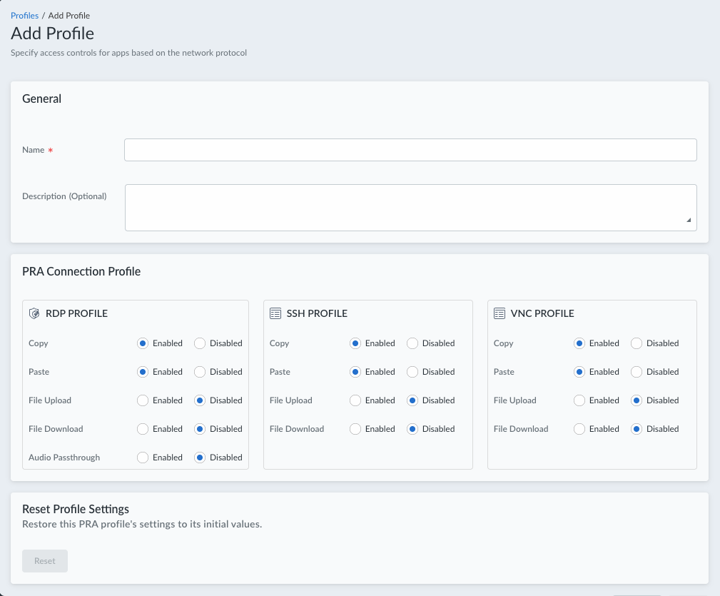 (Optional) If you need to restore the PRA profile to its initial settings, Reset it.Save your profile settings. Your profile is saved to the PRA Profiles table. - For Prisma Access (Managed by Strata Cloud Manager):